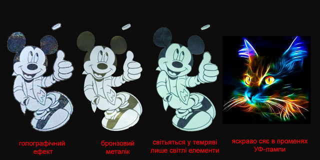 Малюнки з голографічним ефектом, бронзовий металік, з неоновим ефектом в темряві та неоновим ефектом під променями УФ-лампи.